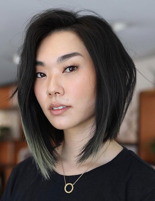 This one is all about angles—shorter in the back, longer in the front, and instantly more “styled.” It’s basically a Medium Length A Line Bob that gives fine hair shape without stealing thickness. Best for round and square faces because the longer front pieces create a slimming effect. Maintenance is medium since the cut looks best with a little bend and movement.