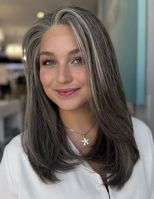 Soft waves through the lengths blend the panels seamlessly into the overall style. The bold framing effect creates a fresh and fashion-forward transformation. This look proves that strategic placement can redefine gray hair beautifully.