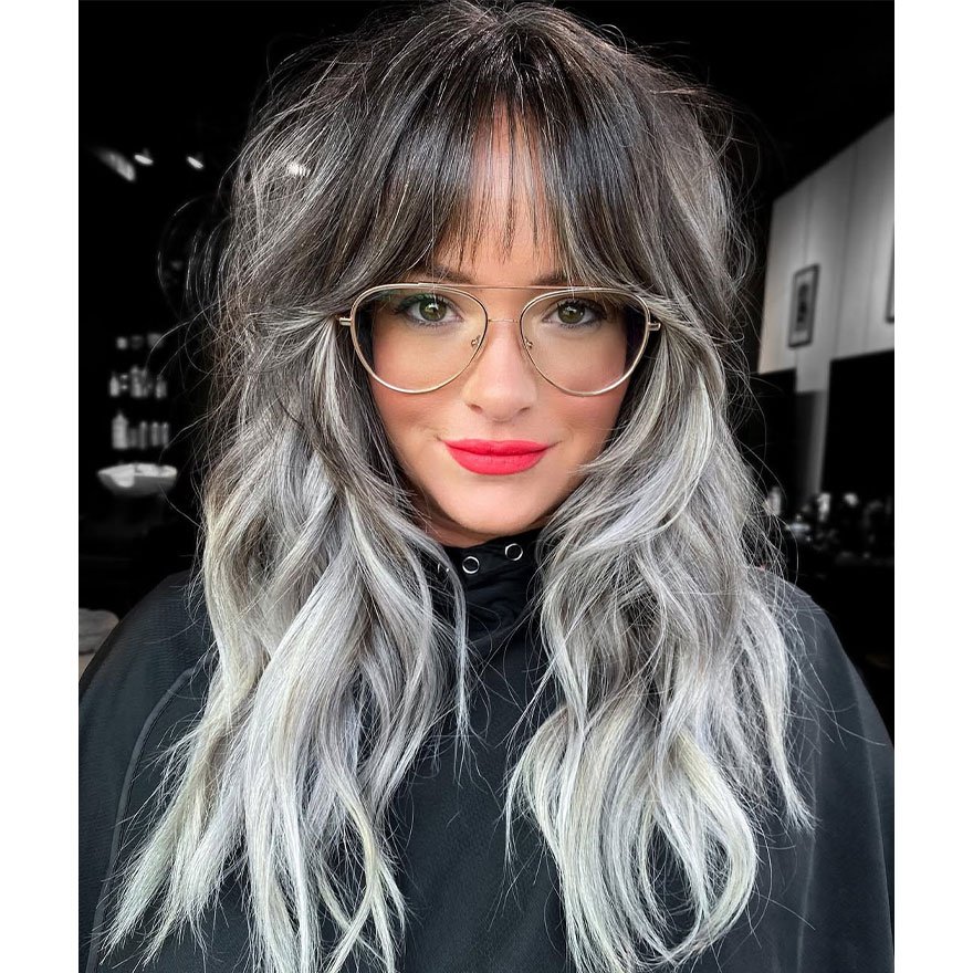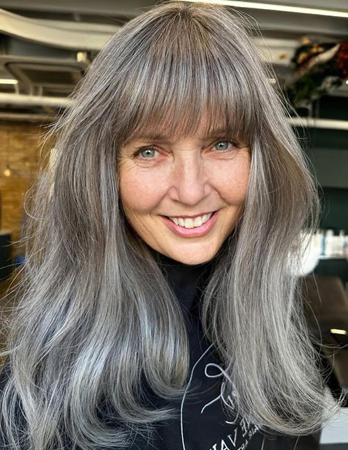 This full fringe salt and pepper long cut pairs bold bangs with striking gray contrast. The fringe frames the face beautifully, highlighting the multi-tonal blend throughout the hair. It’s a statement transformation that feels both modern and timeless.
