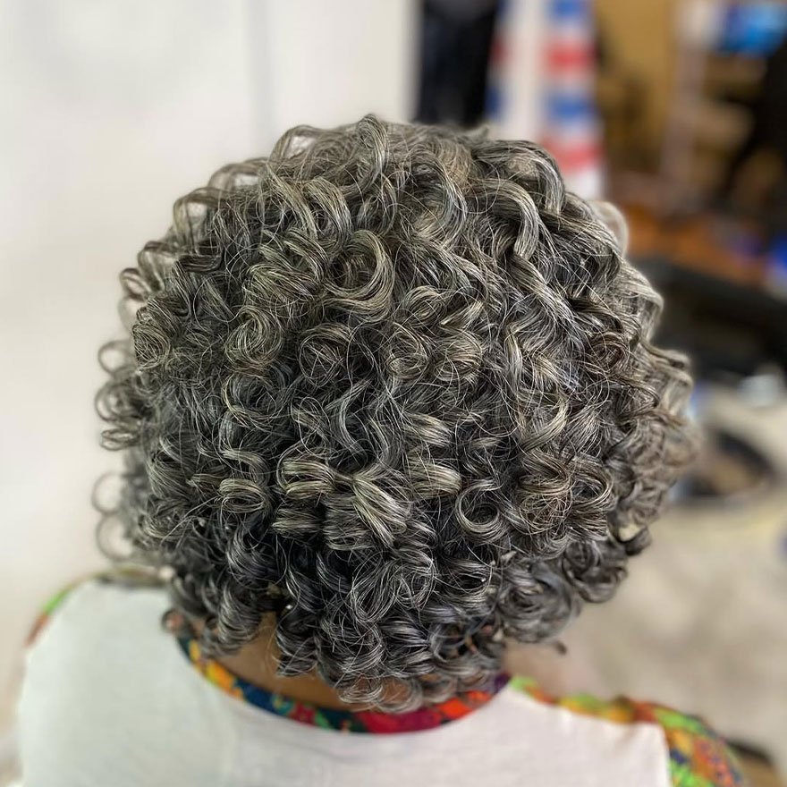 This messy salt and pepper curly texture embraces natural curls with striking gray contrast. Defined spirals showcase the interplay between dark strands and bright silver highlights. The result is a lively, youthful transformation full of personality.
