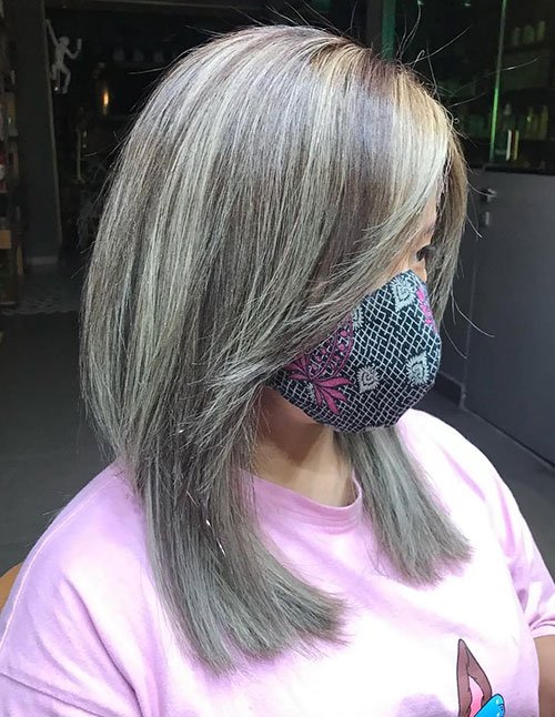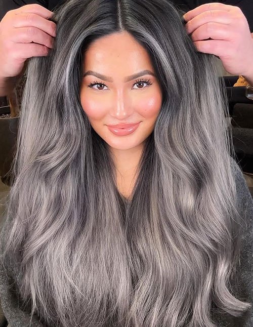 The layered silver balayage combines hand-painted highlights with natural gray undertones to create a soft, blended finish. The gradual light-to-dark transition adds depth and movement, making the hairstyle look effortless yet expensive. It’s a perfect choice for adding brightness without harsh regrowth lines.