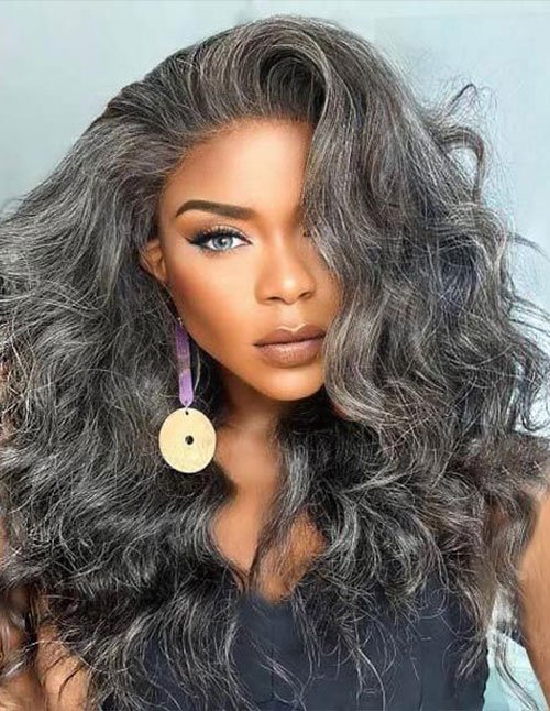 These glam long salt and pepper waves deliver high-impact volume and dramatic shine. Silver strands cascade through darker roots, creating a luminous and eye-catching contrast. The flowing waves amplify dimension and bold transformation energy.