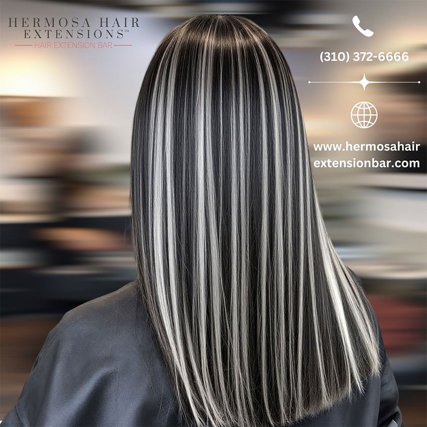 This look enhances natural gray hair with fine, strategically placed foils of silver and dark ash tones. The highlights add brightness and depth, creating a dimensional effect that makes the hair shimmer in natural light. It’s perfect for blending grays seamlessly or enhancing contrast for a refined, modern edge.