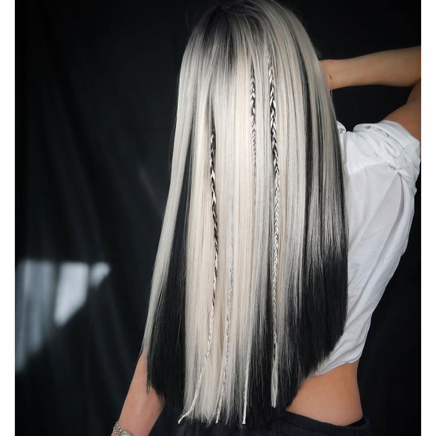 This hairstyle blends the elegance of icy silver tones with the creativity of thin braided streaks woven throughout the hair. The shimmering silver hue catches light beautifully, while the braids add texture and personality. It’s a perfect mix of classic cool and youthful artistry, ideal for medium or long hair lengths.