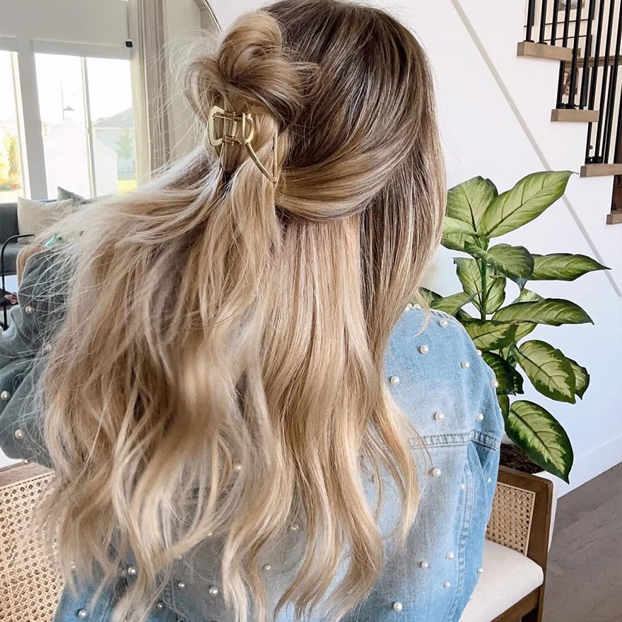 The half-up wavy claw clip hairstyle blends romance with simplicity. Take the top half of your hair, twist it gently, and secure it with a medium claw clip.