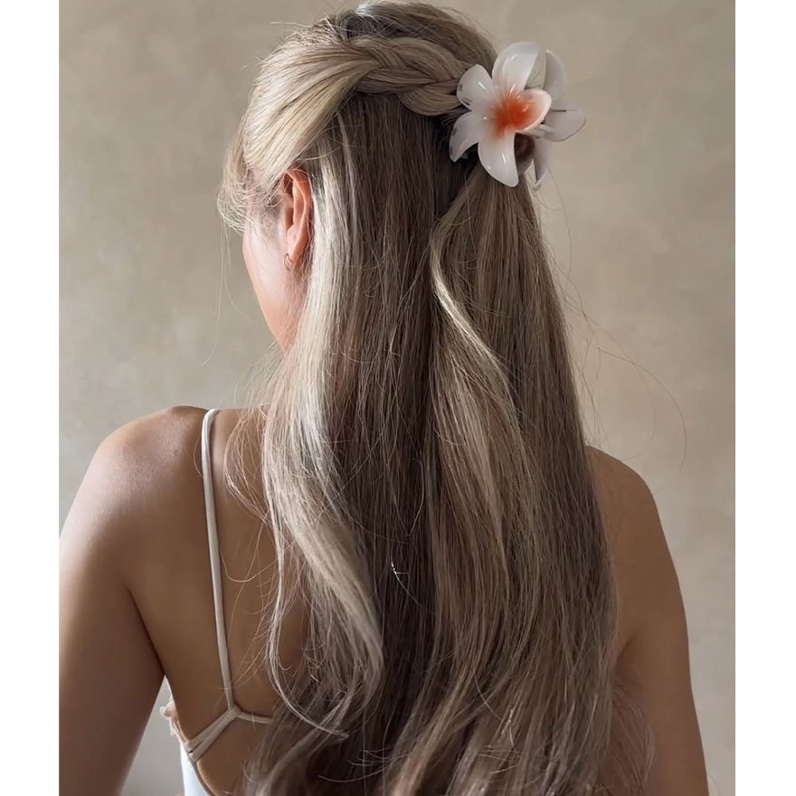 Romantic and feminine, the twisted floral claw clip hairstyle is perfect for special occasions. Twist two sections of hair from both sides, bring them together at the back, and secure with a floral claw clip.
