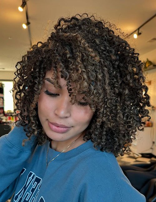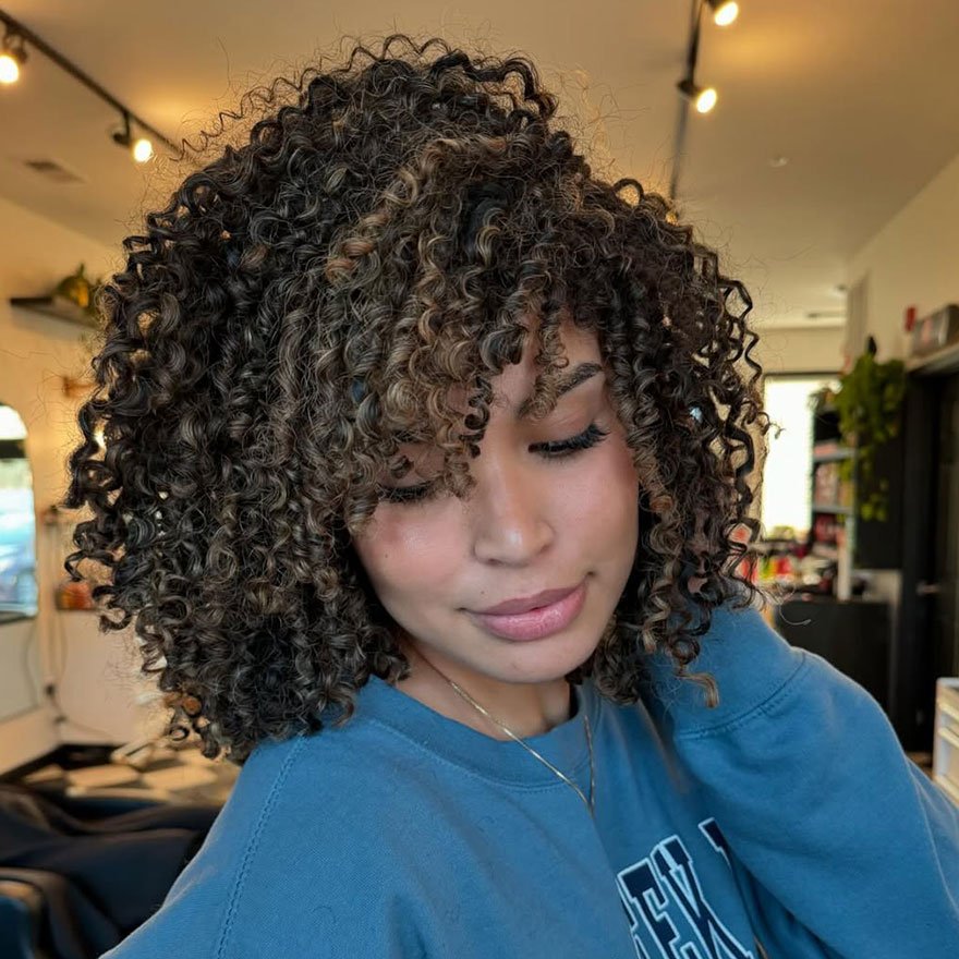 Adding highlights to a short curly bob increases visual depth and dimension. Bangs soften the forehead while enhancing playful texture. This combination creates brightness and movement within compact length.