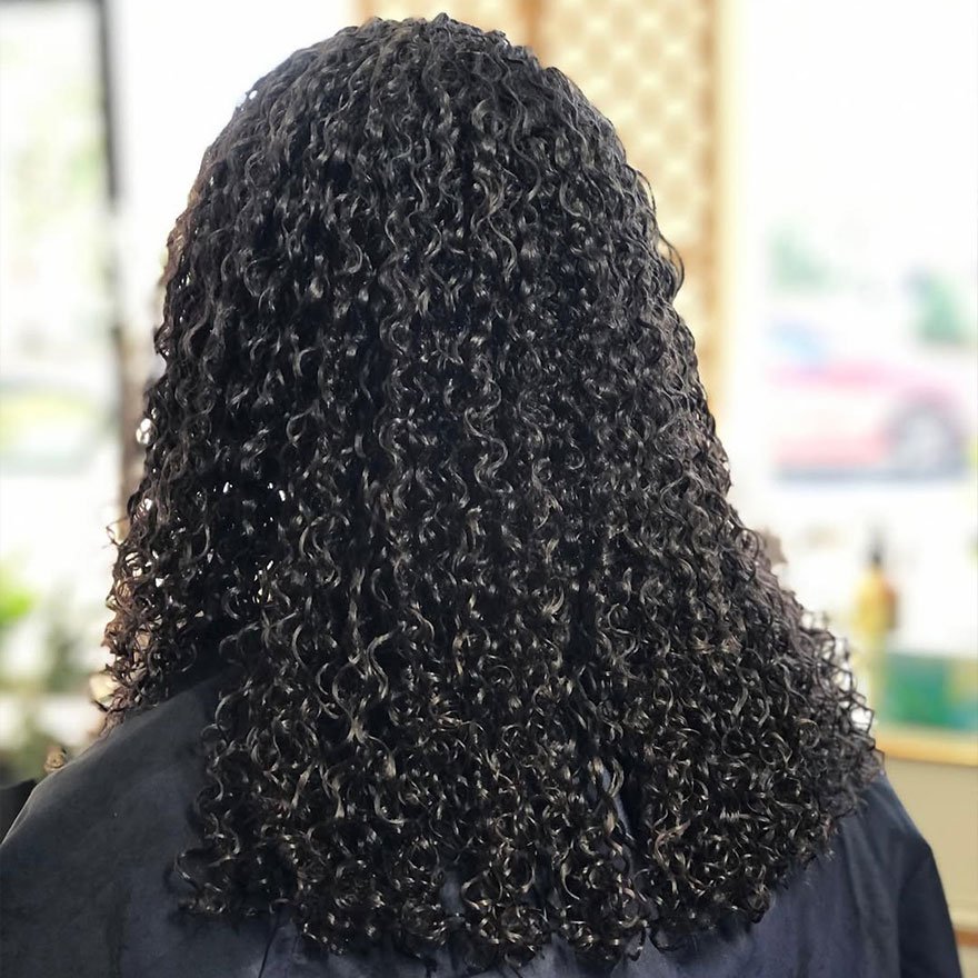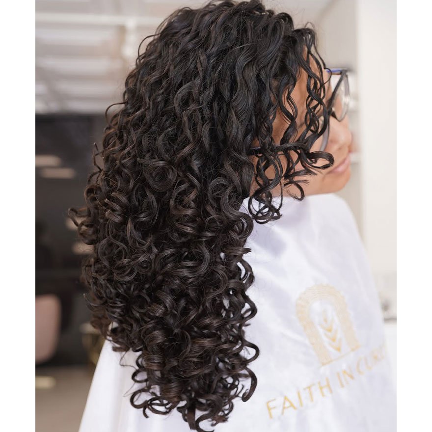 Hydration and curl clumping techniques maximize the finished result. The haircut reduces tangles and improves styling predictability. It highlights texture without excessive shaping.