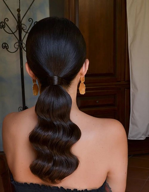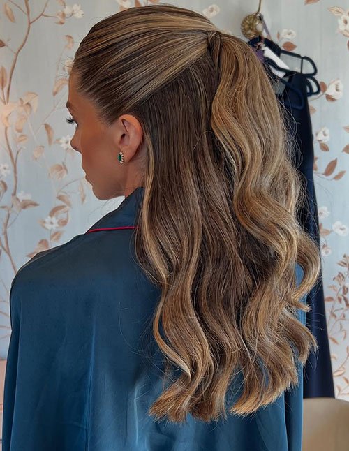 Think of this as the “best of both worlds” hairstyle. You get the lift and freshness of a ponytail, but you still keep the softness of waves. It suits round and oval faces beautifully because the top volume balances the cheeks.