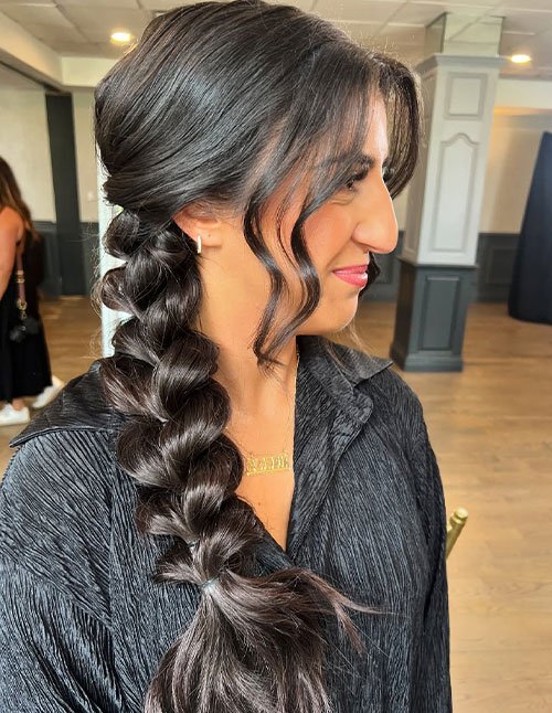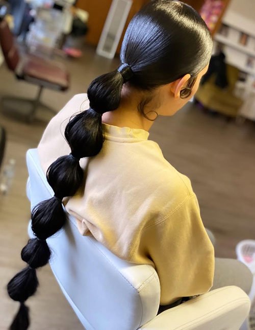 This is the hairstyle that looks complicated… but it’s literally just elastics. A bubble ponytail gives a playful, trendy shape that stands out in the cutest way. It’s best on long hair or thick medium hair because the “bubbles” look fuller.