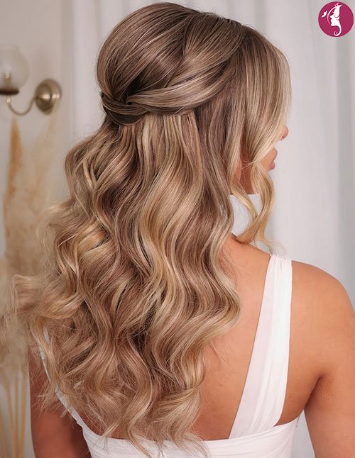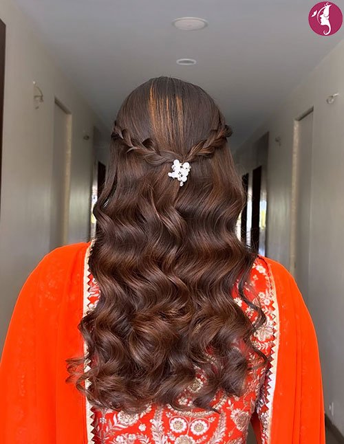 Half-Up Voluminous Glam Waves focus on crown fullness and sculpted lengths. The pinned upper section builds height while waves flow seamlessly below. This creates a balanced bridal-ready silhouette.