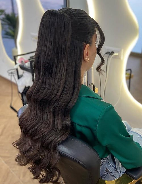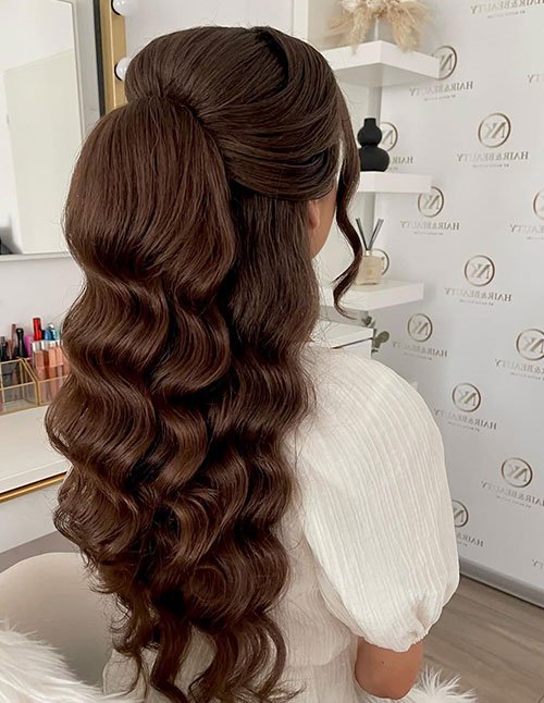 Half-Up High Ponytail Glam Waves blend playful lift with cascading softness. The elevated pony adds height while waves maintain fluid movement. This contrast creates a modern soft glam profile.