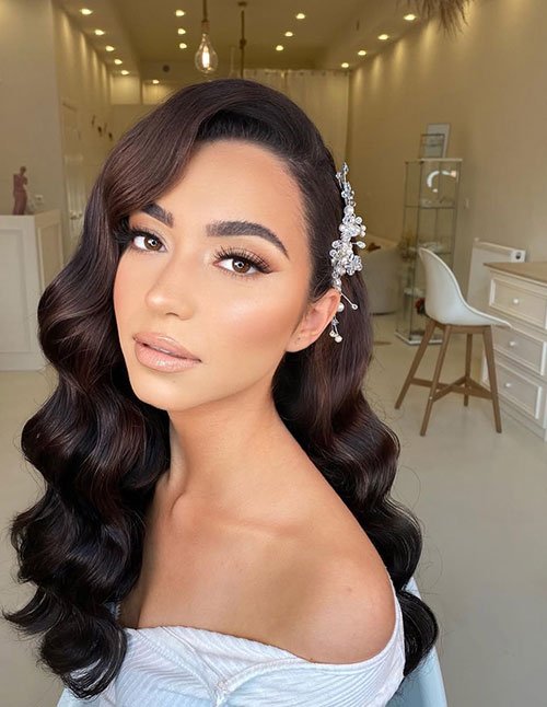 Bridal Side-Swept Hollywood Waves embody classic wedding glamour. The deep sweep frames the face while waves cascade elegantly over one shoulder. This creates a romantic, red-carpet bridal finish.