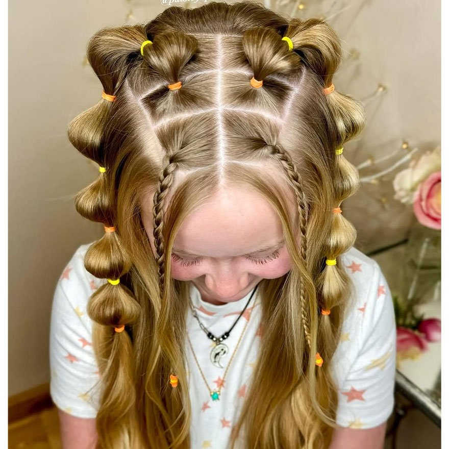 The Bubble Braid with Bow is the ultimate girly hairstyle — charming, easy, and full of personality. You simply tie your hair into one or two ponytails, then space out elastics to form bubbles. Add a cute bow at the end, and you have a picture-perfect style that’s both youthful and chic.