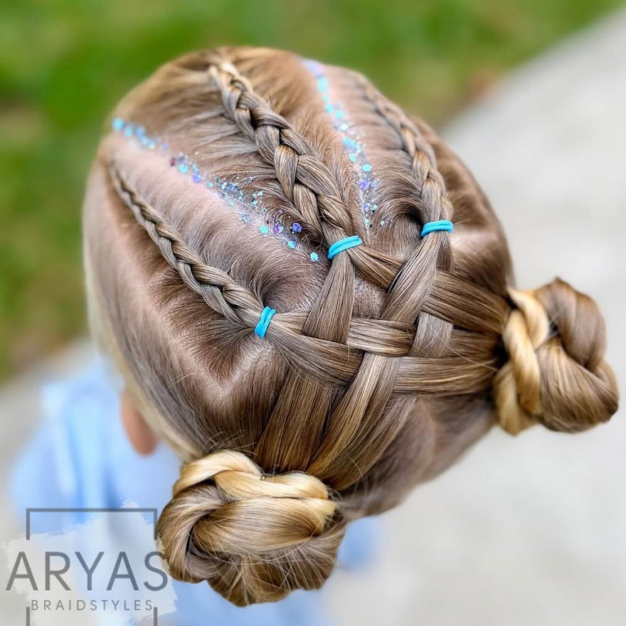The Crisscross Braids with Buns look may seem intricate, but it’s all about clever elastic placement. You create mini ponytails, cross them over each other, and tie them again — no actual braiding involved. After securing each side, you twist the ends into small buns for a cute, youthful finish.