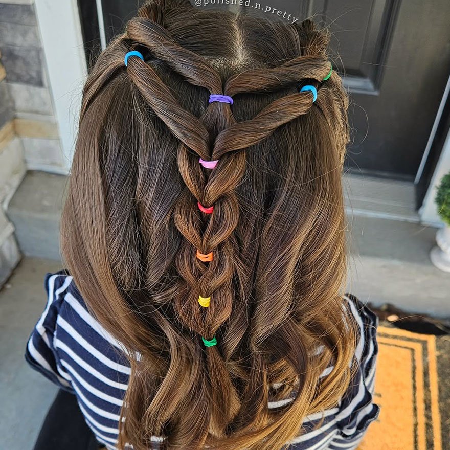 The Heart-Shape Elastic Braid is one of the most adorable and creative hairstyles ever. It’s made by parting the hair in a heart shape and using small elastics to outline and connect each section. Despite its intricate appearance, it’s surprisingly simple — perfect for beginners who love cute, romantic styles.