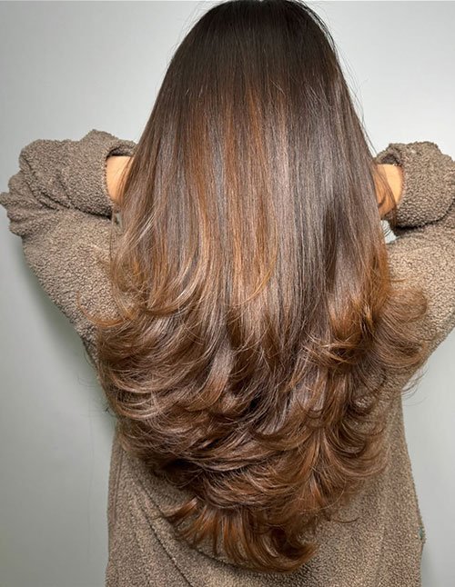 This V-cut blends structure with softness through medium-to-long cascading layers. The shape adds visual interest while keeping the length flowing naturally. It works best on medium to thick hair types. Styling effort remains medium, often enhanced with a blow-dry for smooth movement.