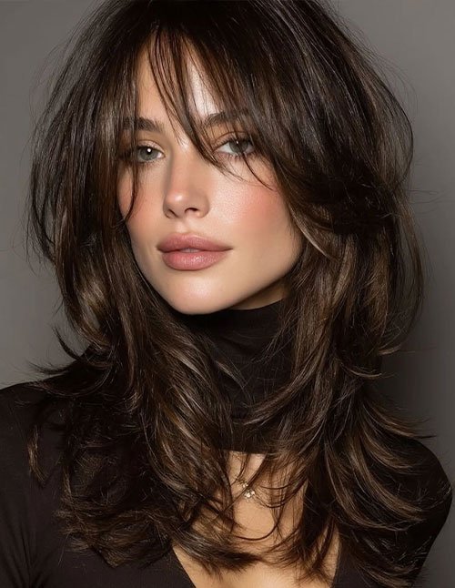 This long layered haircut blends soft curtain bangs into flowing layers for a seamless, face-framing effect. The swoopy bangs gently highlight the cheekbones and jawline, making this style especially flattering for oval, heart, and longer face shapes. It works best on straight to softly wavy hair that can hold smooth movement. Styling stays at a medium level, usually needing a round brush or soft rollers to maintain the curve of the bangs.