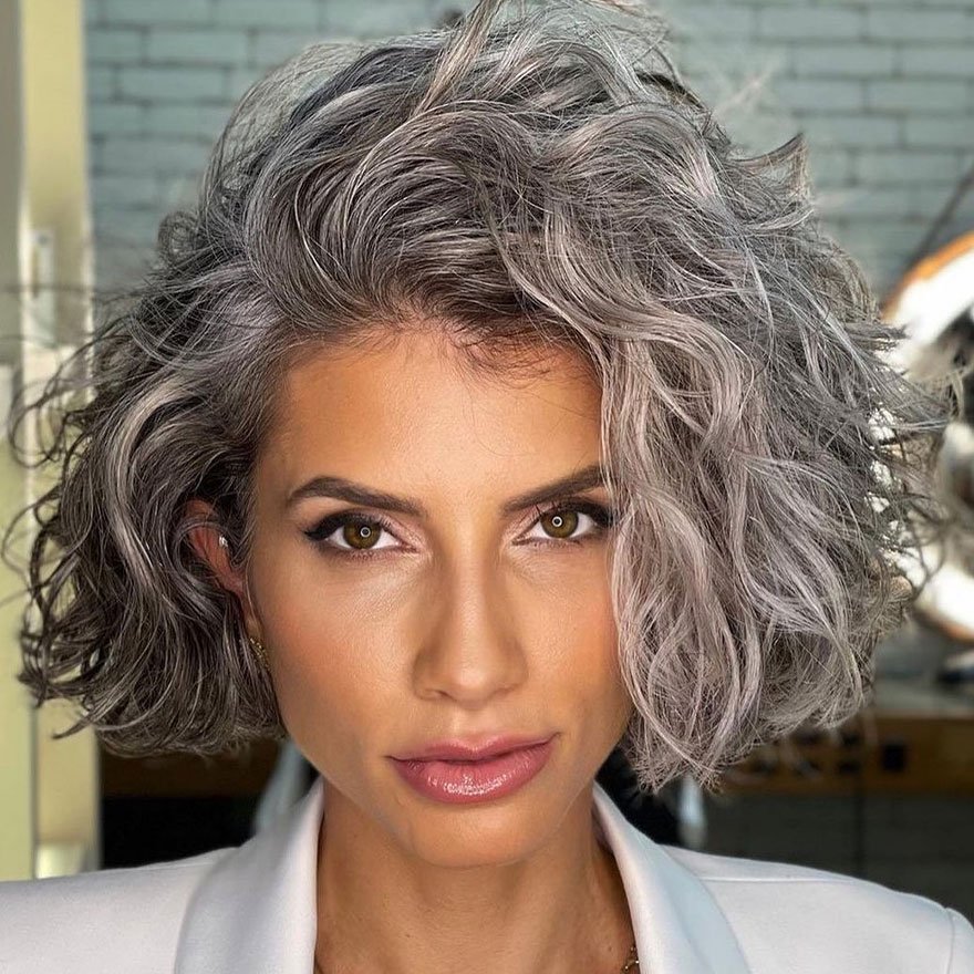 This hairstyle celebrates natural curls, enhancing their shape to form soft, full-bodied volume. The gray tone gives each curl extra dimension, making them pop under the light. It creates a halo effect that frames the face beautifully.