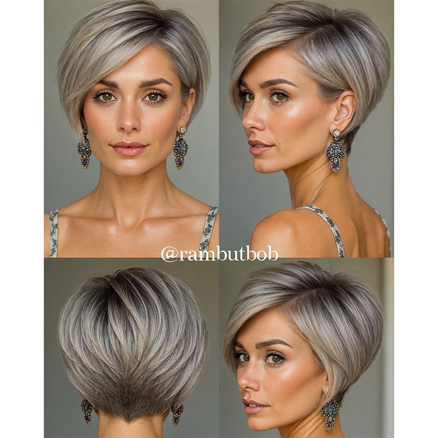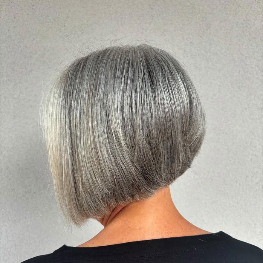 This haircut features a stacked shape — shorter in the back and gradually longer toward the front. It builds instant volume at the crown while giving a clean angled silhouette. The gray color sharpens its polished, sleek appearance.