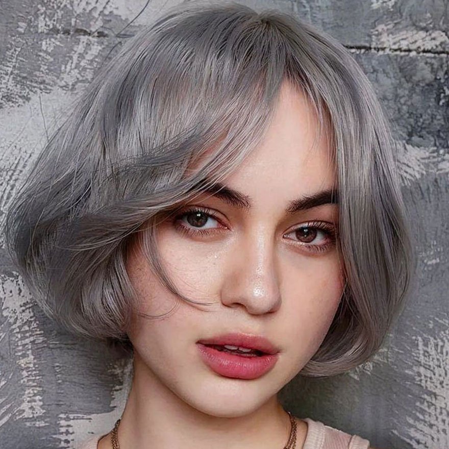 A clean bob cut sits just at the jawline, while soft side bangs sweep across the forehead for a flattering frame. It offers structure and polish while keeping the overall shape light. The gray tone adds a hint of sophistication.