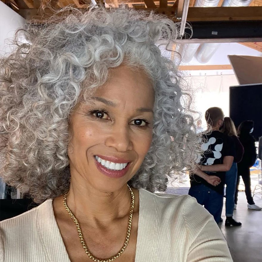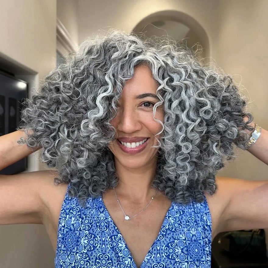 The key is definition — using curl creams or diffusers to keep each spiral bouncy and frizz-free. It gives a romantic, radiant effect that makes gray hair glow with life.