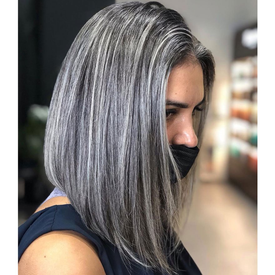 This long bob is cut blunt at the ends for a sharp, clean shape while maintaining a medium length. The straight styling shows off the smoothness and shine of gray strands beautifully. It’s sleek, structured, and perfect for a polished everyday look.