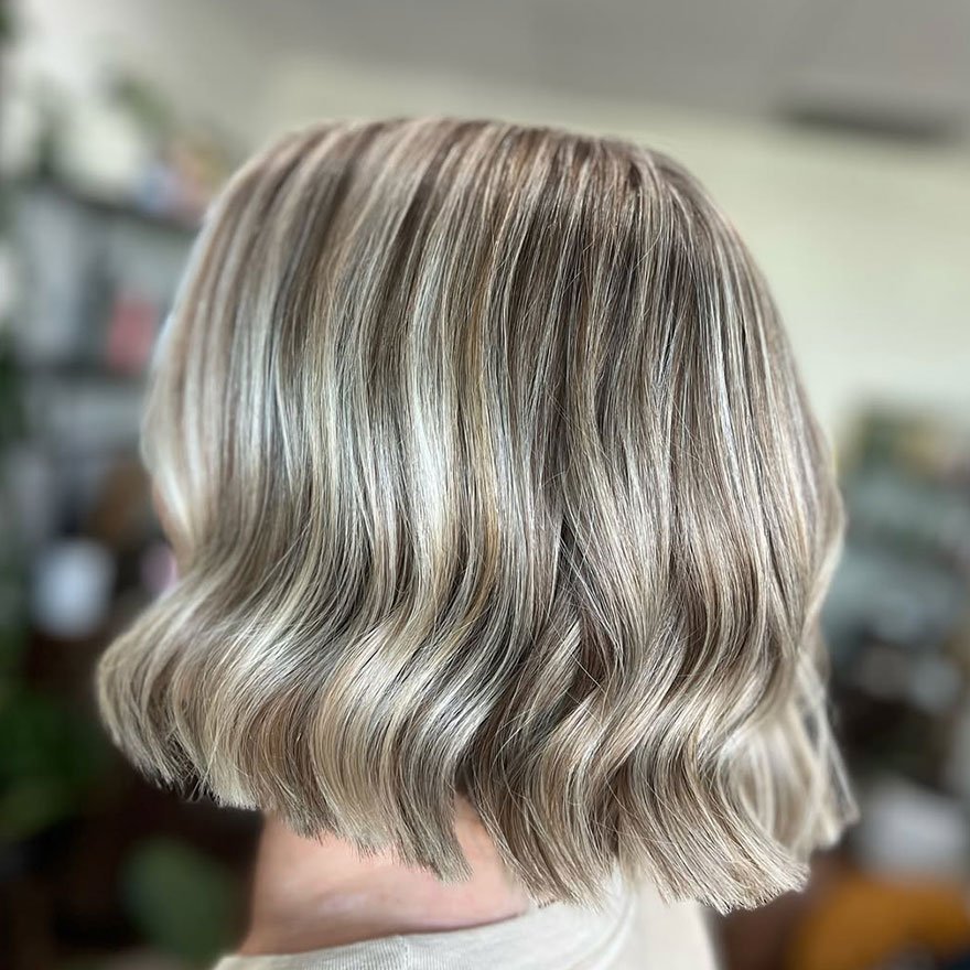 Styled in loose silver waves, it reflects light beautifully, giving the hair a healthy, luminous glow. The cool tone softens facial features while the movement keeps it youthful and elegant. It’s a go-to for clients who want volume with a refined finish.