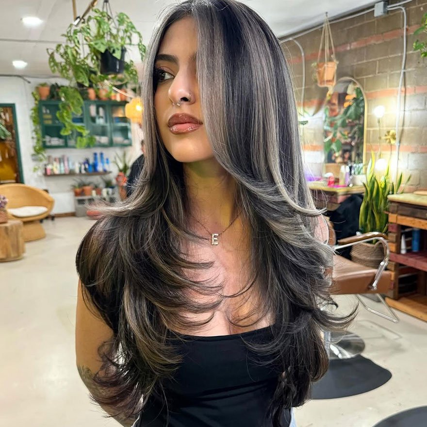 Long layers keep this haircut light and flowing, while frosted highlights bring a luminous touch to the strands. It creates natural face-framing movement without losing any length. The layered cut adds bounce while staying smooth and elegant.