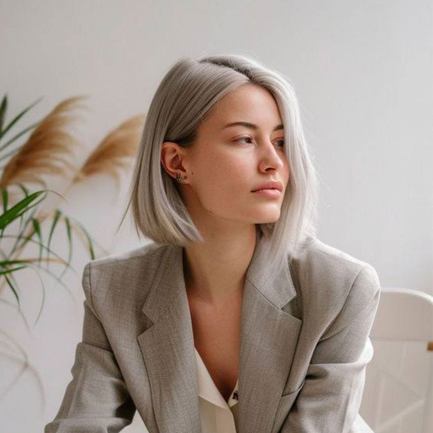 This jaw-grazing bob is all about precision — clean, blunt edges with subtle shine for a Parisian-inspired finish. The gray shade adds a sophisticated twist to its simple silhouette. It’s effortlessly elegant yet low-maintenance.