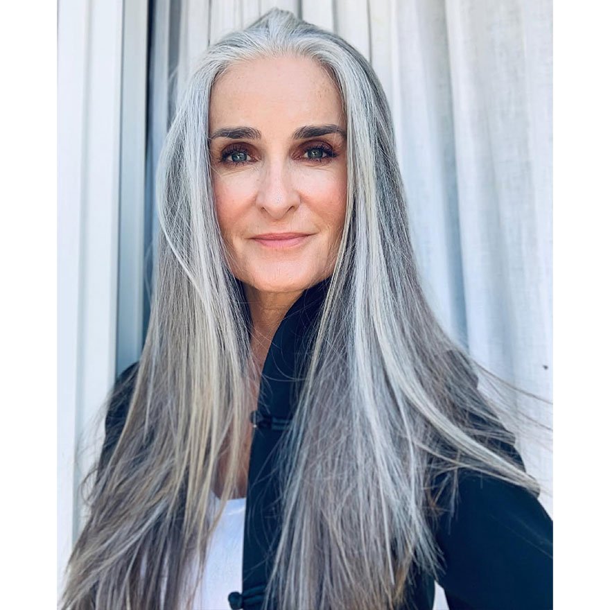 This look is all about shine — long gray strands styled pin-straight to achieve a glassy finish. It has minimal layers for maximum sleekness, which keeps the shape clean and smooth. It highlights healthy, well-maintained hair beautifully.