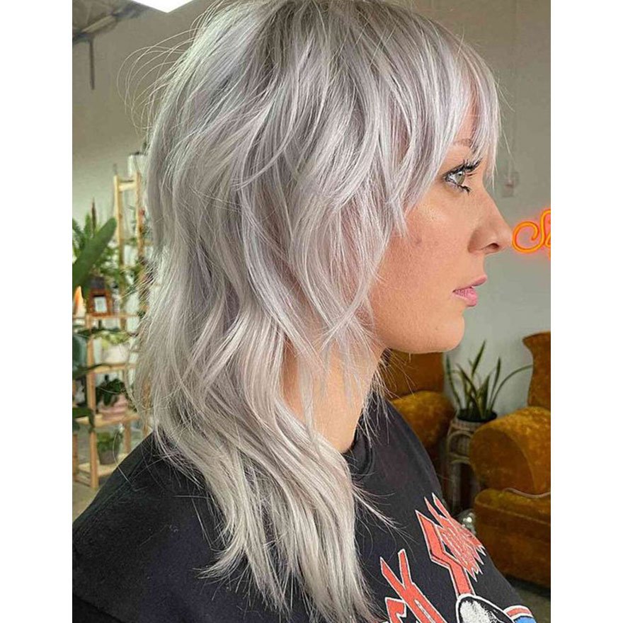 This bold bob is cut in a precise bowl shape that wraps evenly around the head. The silver tone highlights its sculpted edges, creating a futuristic, high-fashion vibe. It’s a daring yet clean-cut look that turns heads instantly.