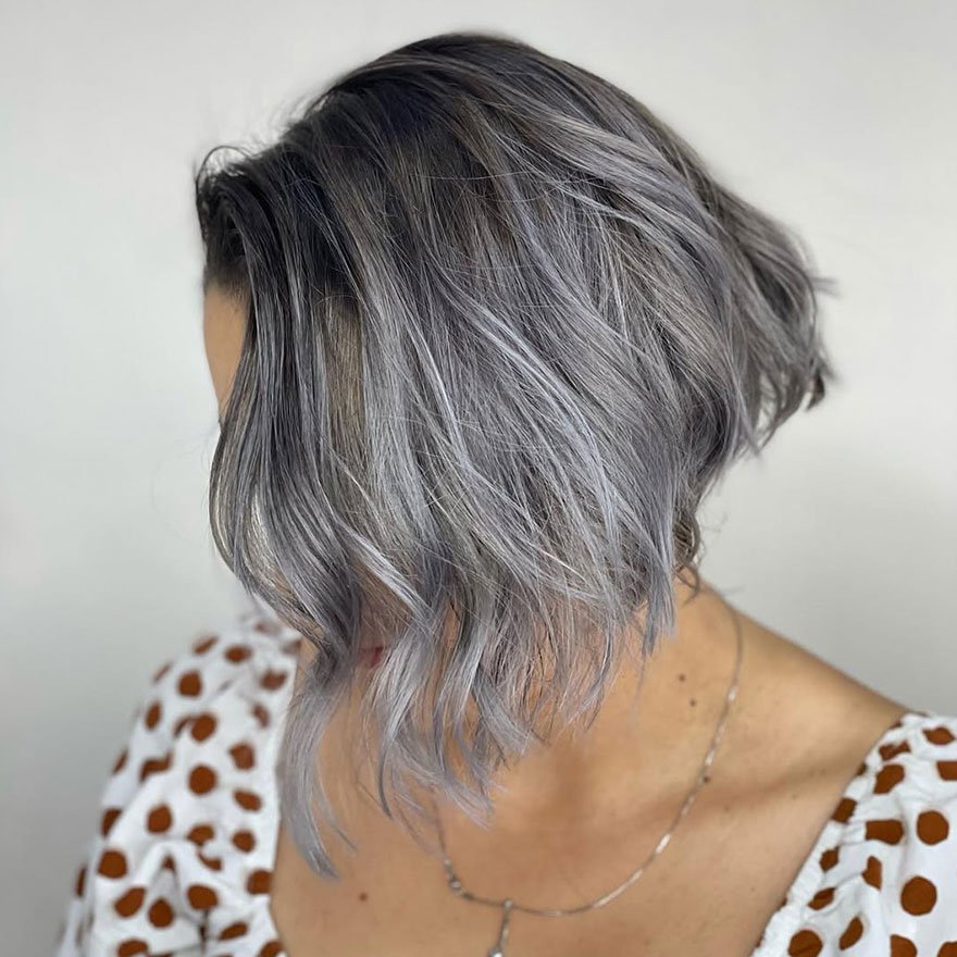 This bob is shaped with soft layers and styled in loose waves for airy volume. The smoky gray tone gives depth, making the waves stand out under the light. It’s equal parts structured and playful.