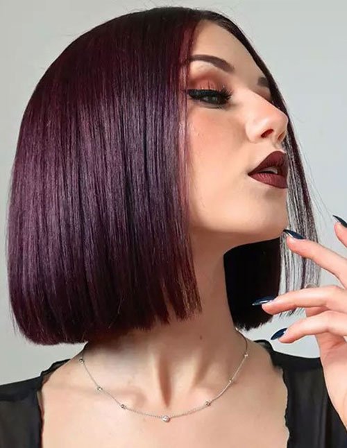 The sleek classic one-length bob is cut evenly all around, creating a smooth and balanced shape. Its uniform perimeter gives the hair a dense and polished appearance. This timeless haircut is known for its simplicity and sophistication.
