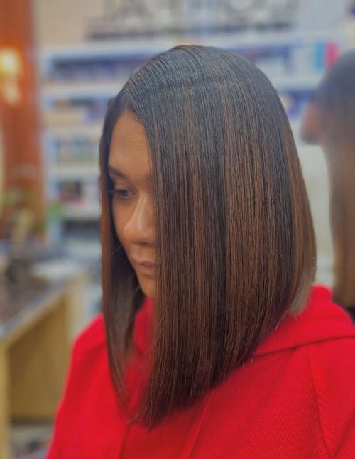 It’s perfect for maintaining maximum length while achieving a sharp, defined outline. The cut suits straight hair best, as it highlights the precision of the blunt edge. Regular trims help maintain its clean and structured appearance.