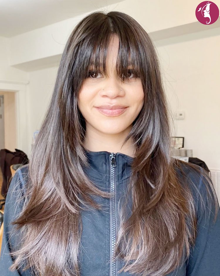 Long layers paired with airy curtain bangs can soften straight hair beautifully while adding shape around the face. The wispy fringe blends effortlessly into the layers, giving the entire hairstyle a romantic and lightweight feel. It’s perfect for anyone who wants movement without losing the sleek texture.