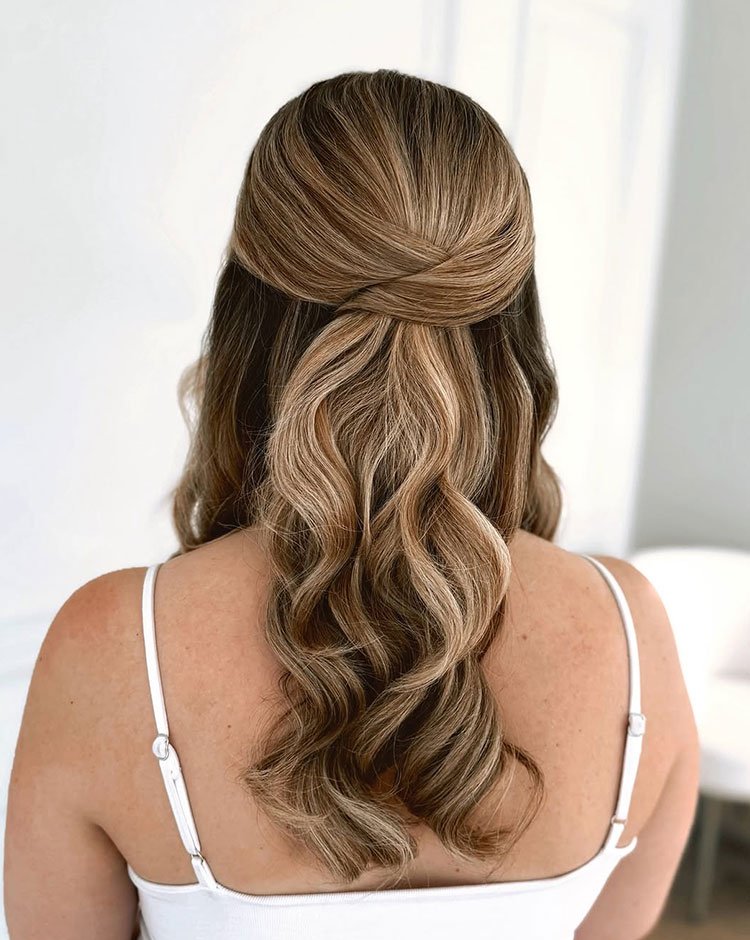 Half-up soft waves are the definition of romantic, light, and universally flattering. This hairstyle blends the best of both worlds — hair pulled away from the face for structure, while the waves create volume and softness. It’s the kind of look that fits everything from garden weddings to formal ballroom events.