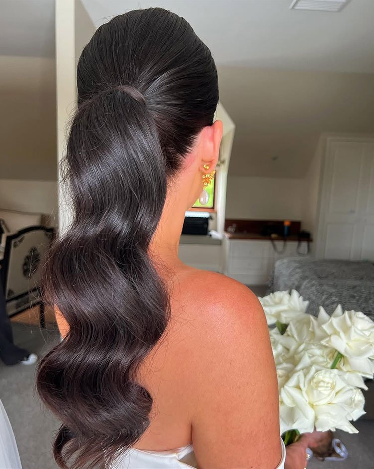 A sleek wavy ponytail is the perfect mix of chic and modern, giving you a refined look without feeling stiff or overdone. The polished top creates clean structure, while the soft waves in the ponytail give dimension and a graceful, flowing finish. It’s ideal for evening events, receptions, and guests who want a stylish yet manageable look.