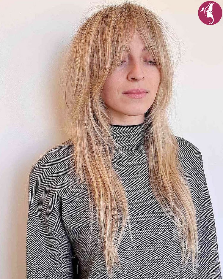 A soft shag-inspired hush cut adds texture without losing that signature airy look. The layers give shape and dimension while keeping the overall feel relaxed and natural. It’s ideal for medium-length hair that needs movement and personality.