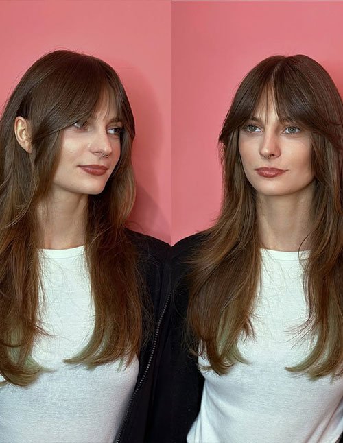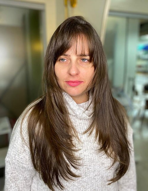 This long natural brown hush cut embraces subtle layering for gentle flow. The light fringe softly frames the forehead without overpowering the face. The texture feels smooth yet airy.