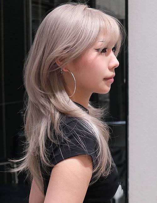 Ash pearl tones elevate this long hush cut with a cool, luminous finish. The layered structure flows seamlessly, creating soft movement from crown to ends. The airy texture ensures the hair feels light and touchable.