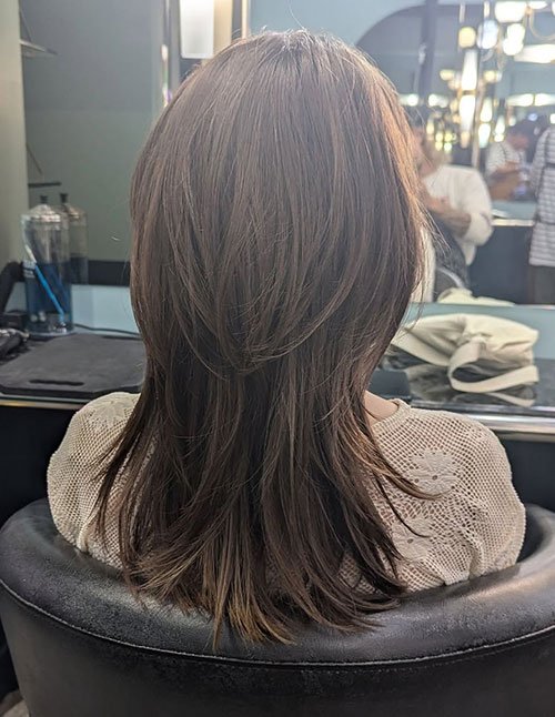 Designed for an effortless aesthetic, this cut gives volume at the crown while keeping the ends light and breezy. The natural brown tone adds subtle dimension that complements the hush layering technique. It’s perfect for achieving a balanced, flattering everyday look.