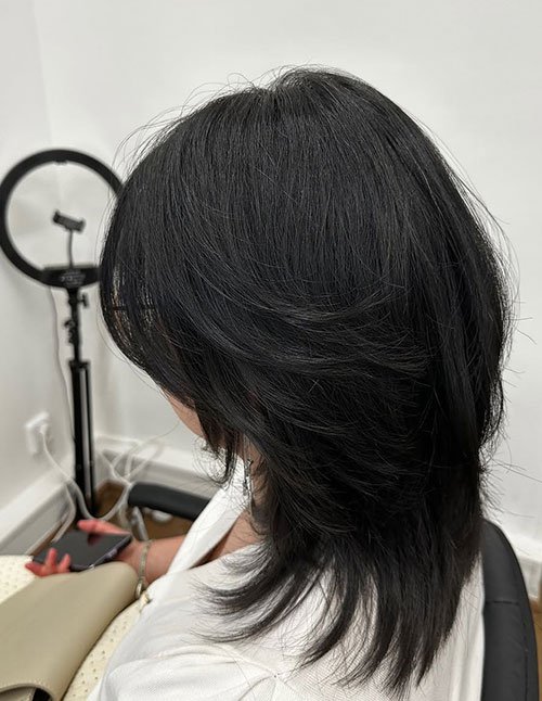 This soft black medium hush cut reveals dimensional layering from the back and side angles. The structure adds lift at the crown while tapering gently toward the ends. Movement is visible even without heavy styling.
