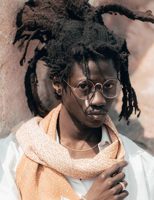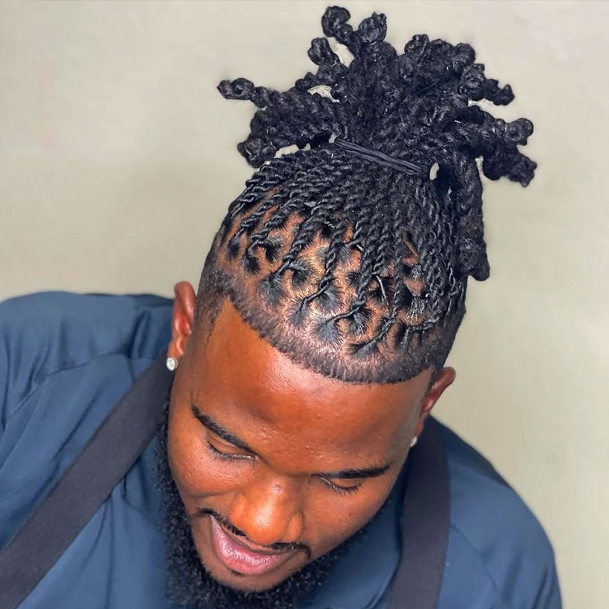 This bold combination pairs a clean fade haircut with twisted dreads tied neatly in a top knot. It’s sharp, expressive, and ideal for men who want a stylish balance between structure and personality. The fade keeps the edges crisp, while the twists add volume and flair.