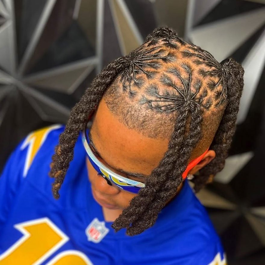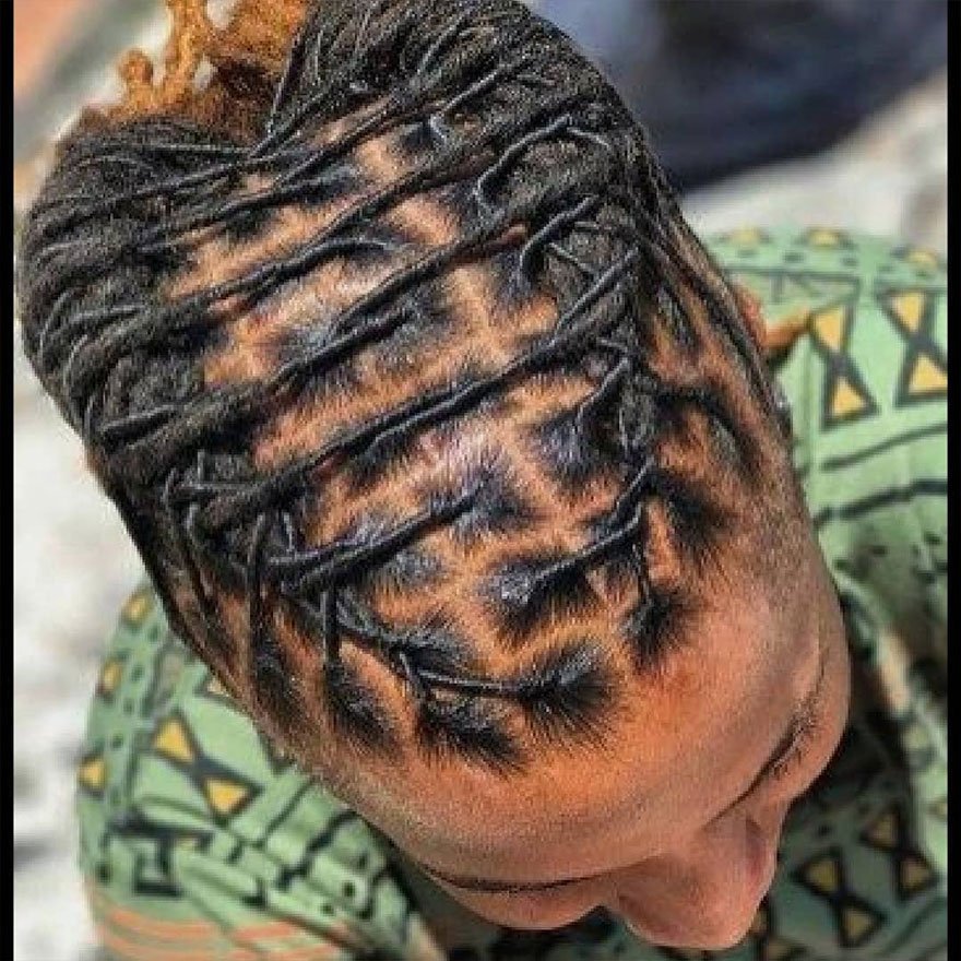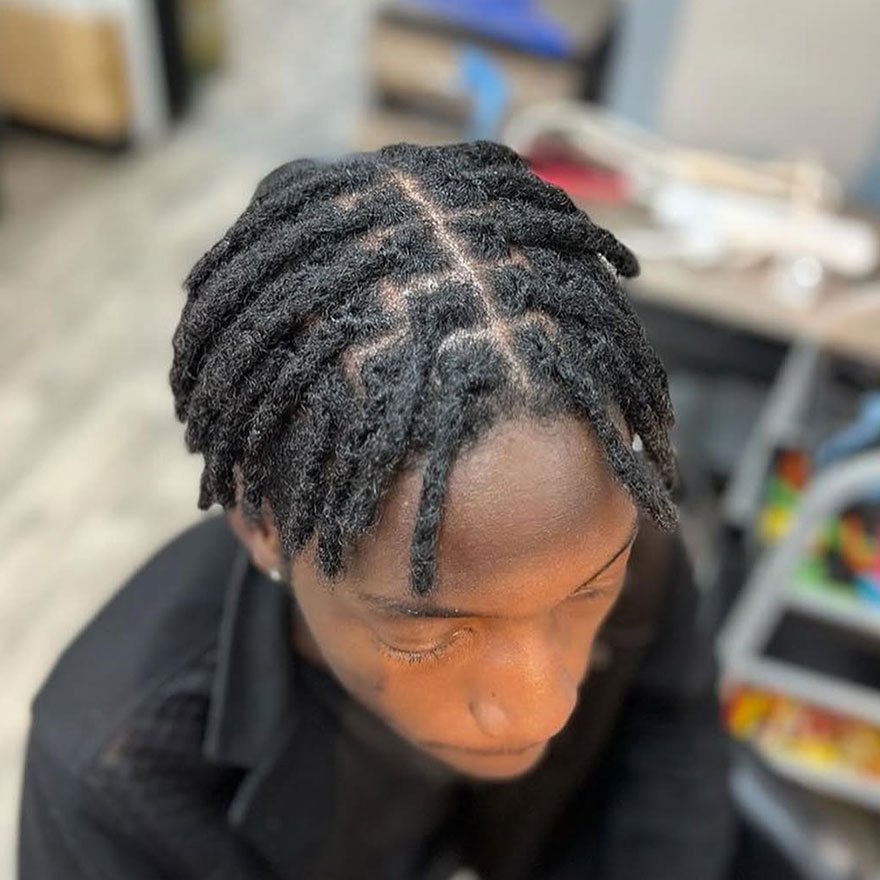 The spider-web retwist is a creative hairstyle featuring an intricate crown-pattern design. It’s bold, expressive, and perfect for men who love detailed artistry in their loc maintenance.