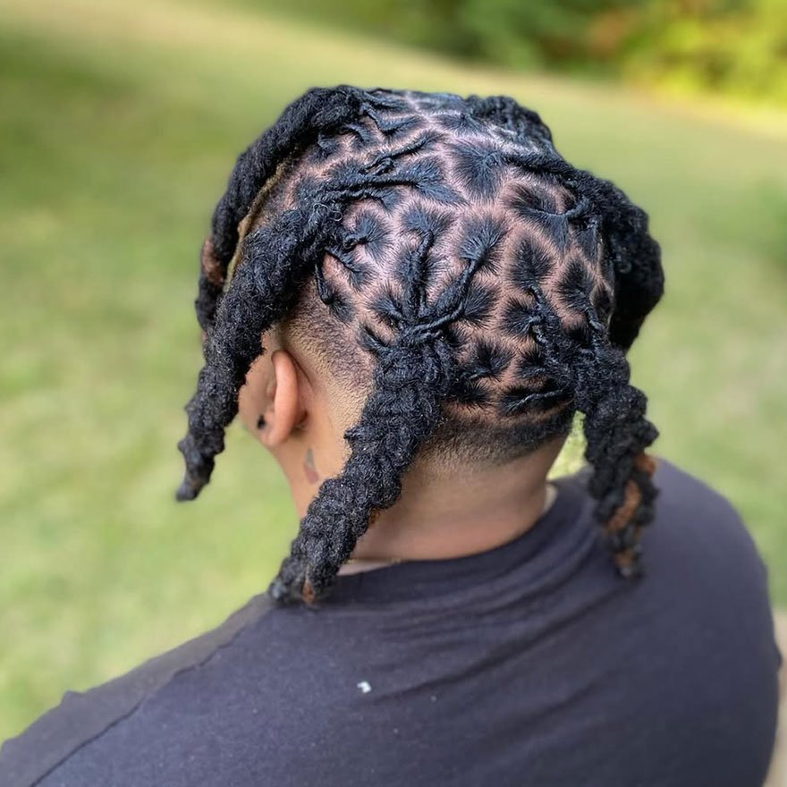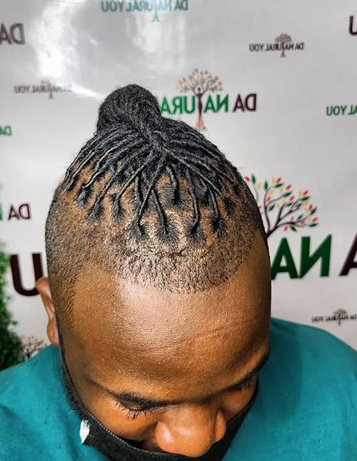 The back-centered design keeps the front simple while adding surprise detail at the crown. This approach allows for clean growth while maintaining artistic flair. It’s perfect for men who want subtle yet distinctive dread styling.