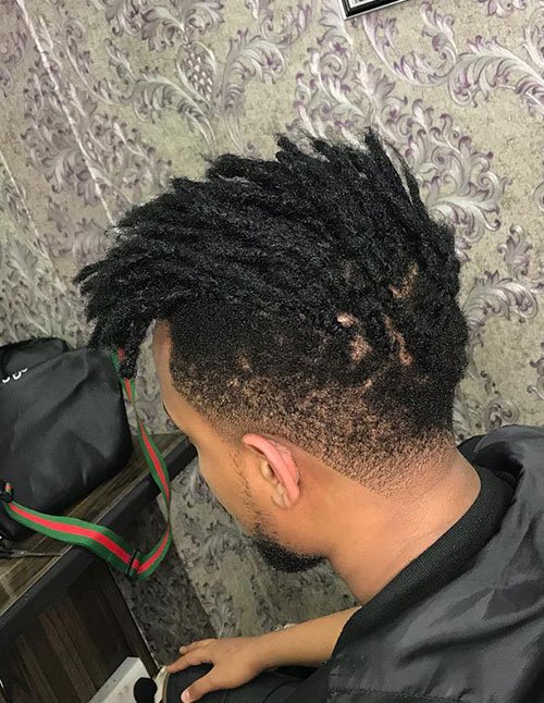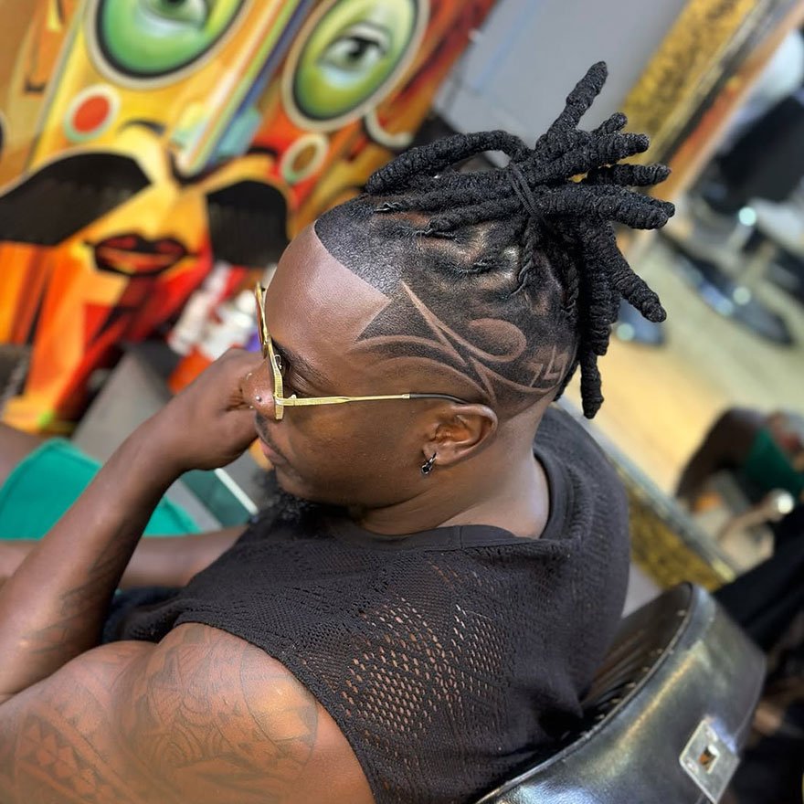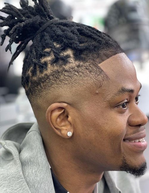 This edgy look combines a high-top haircut with artistic fade designs and well-defined dread styling. The clean fade frames the bold locs on top, creating a high-contrast style that demands attention.