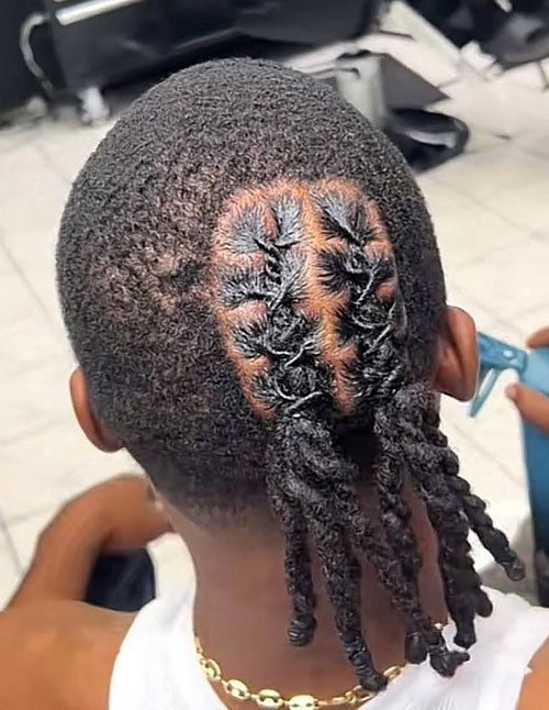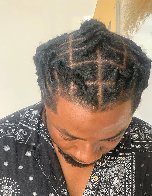 Lobster Tail Starter Loc Bun features neatly sectioned starter locs styled into a structured top knot with a visible grid pattern. The defined parting enhances symmetry and keeps the scalp design crisp and intentional. It’s a polished choice for men in the early stages of their loc journey.