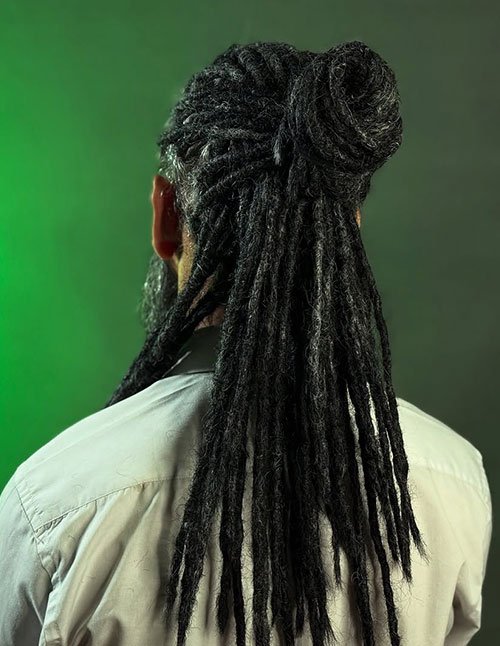 By pulling only the upper portion into a bun, the look stays practical without sacrificing personality. It works well for both casual wear and elevated street-style outfits. This modern hybrid approach keeps dreadlocks versatile and fashion-forward.