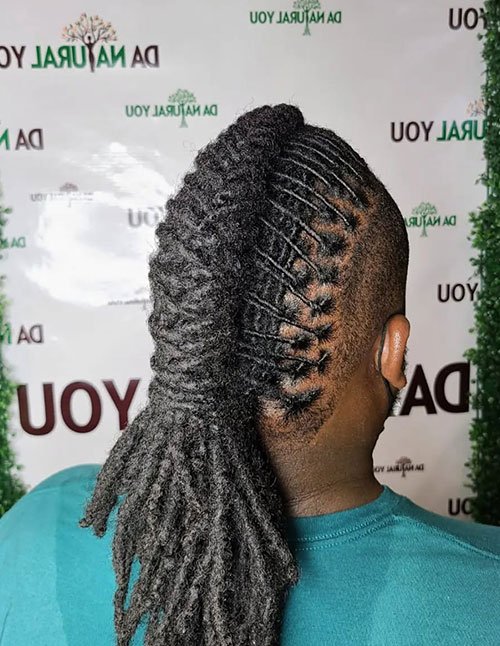 The central braid adds texture and dimension to the mohawk layout. This fusion of braiding and loc styling creates a standout statement look. It’s ideal for men who want a daring yet controlled appearance.